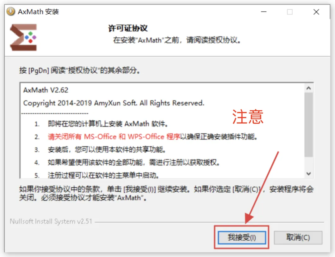 5、接受协议:点击我接受。安装前请确保断网,并关闭Office和WPS软件。