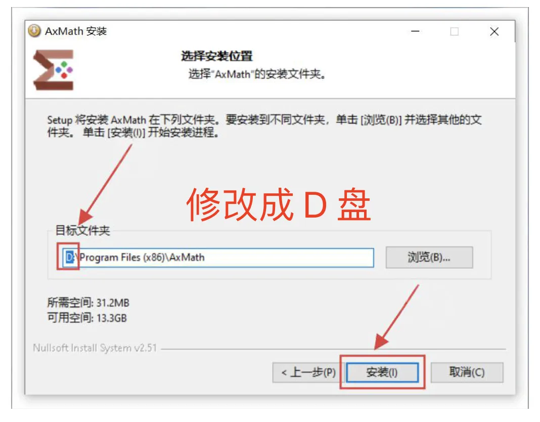 7、更改安装路径:将路径首字母C改为D(安装到D盘),点击:安装。路径不要有中文等特殊字符。