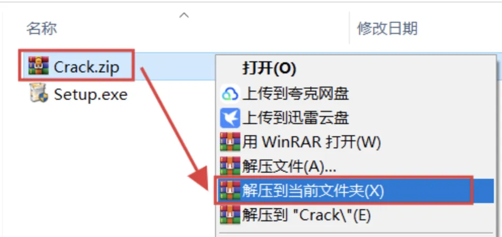 4、解压激活工具:返回解压文件夹,右键 Crack 压缩包。