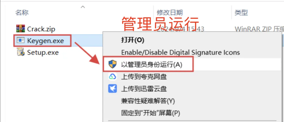 5、运行Keygen:选中解压出的:Keygen,右键:以管理员身份运行。