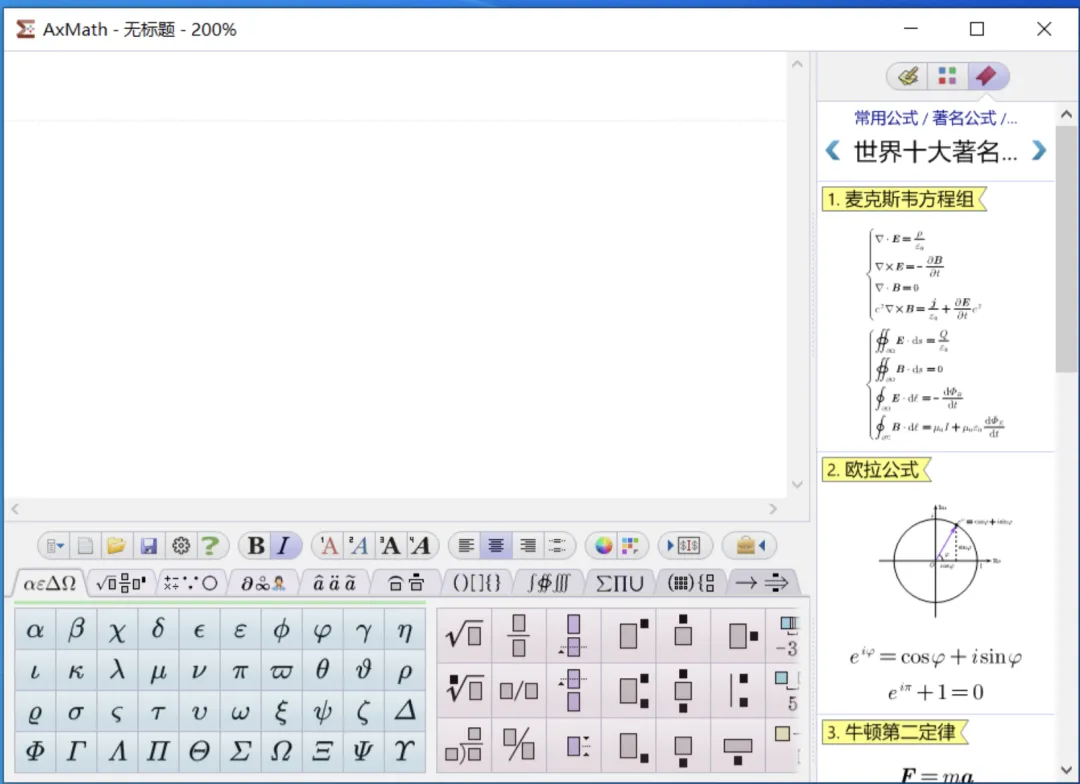 AxMath 是一款专为理工科人,设计的公式编辑器,功能覆盖数学、工程及物理等等领域。