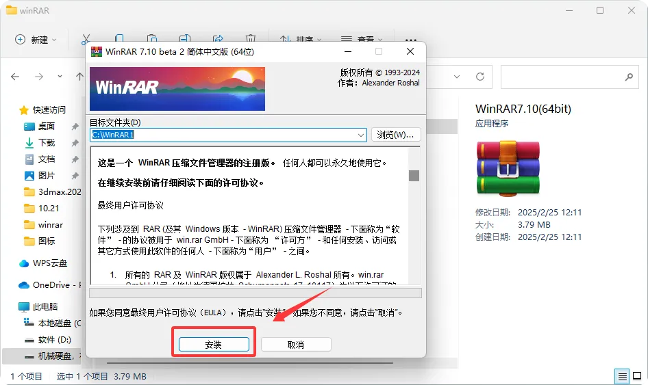 2. 点击【安装】(压缩包很小,建议直接安装到默认C盘)。