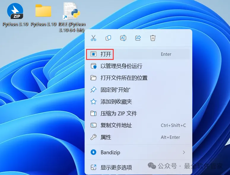 10、右键桌面上的【IDLE(Python 3.10)软件图标】,点击【打开】