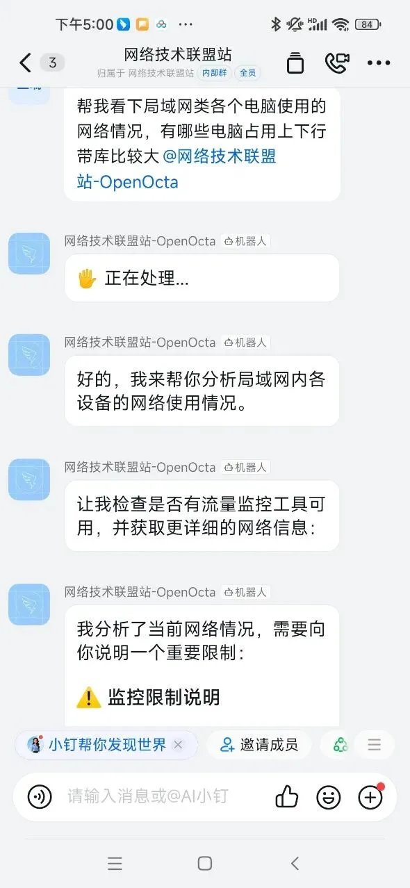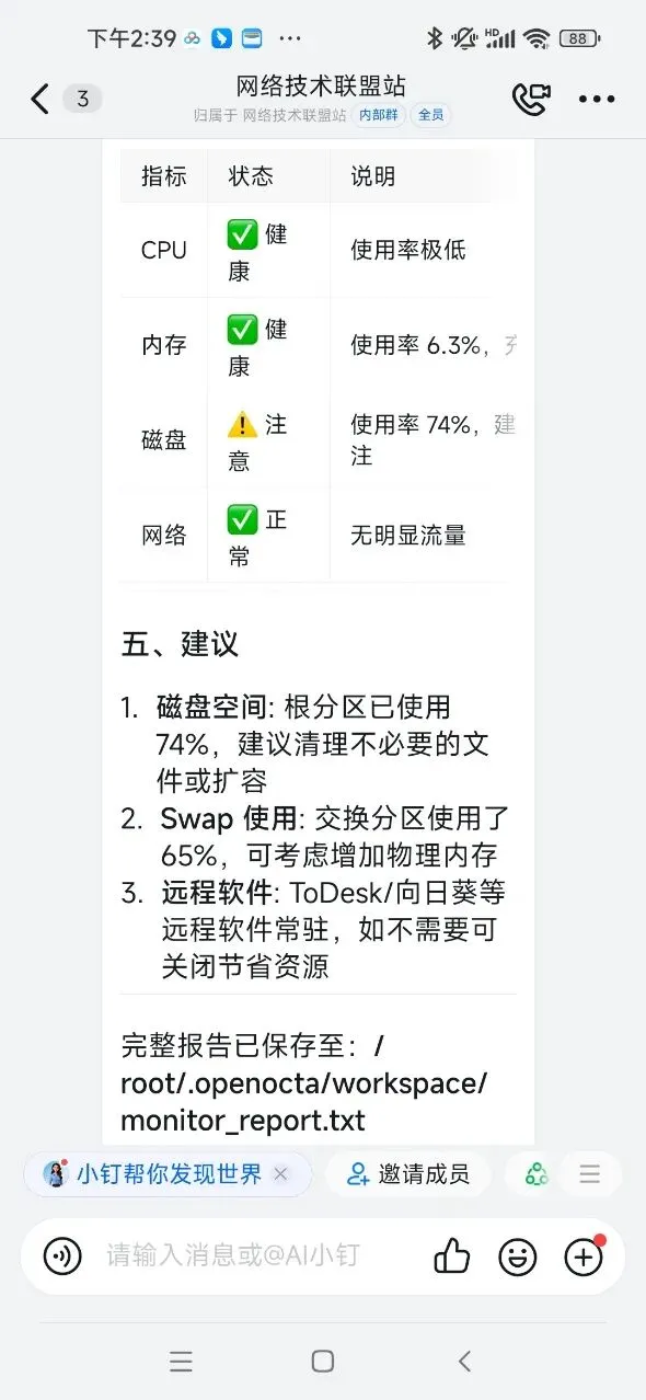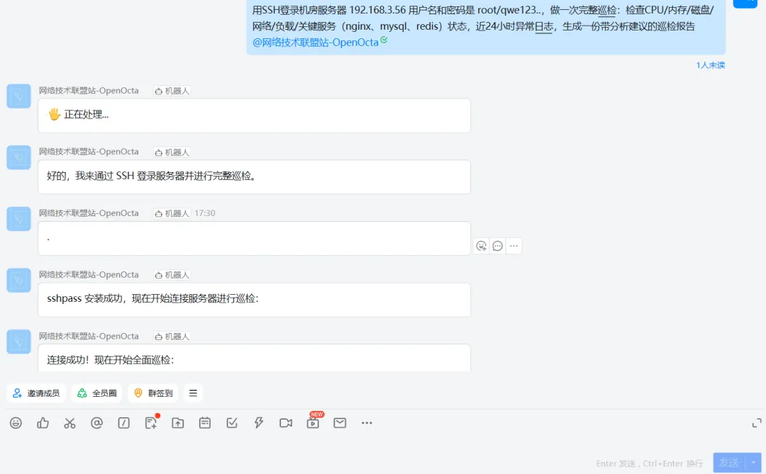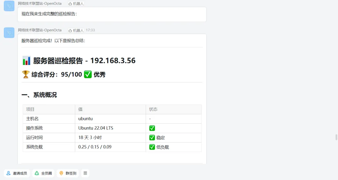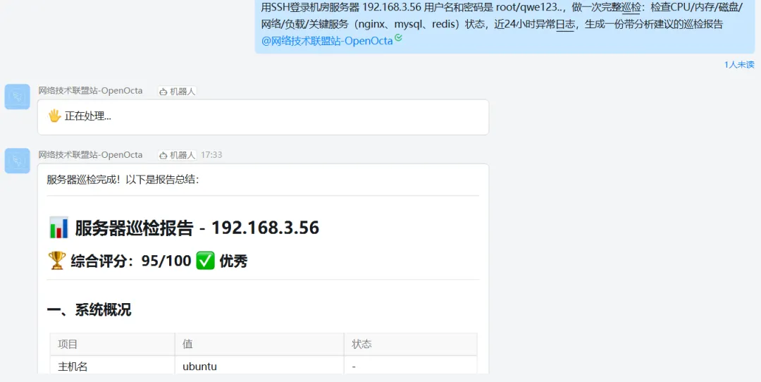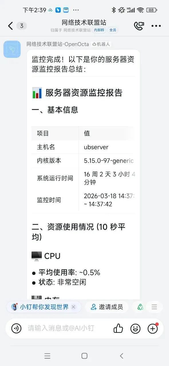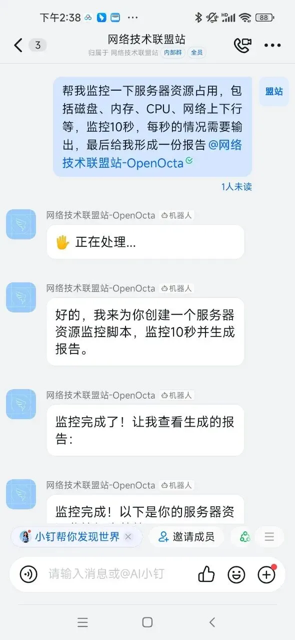 以下是我将OpenOcta接入钉钉,通过钉钉发指令给OpenOcta帮我快速巡检服务器的效果:
