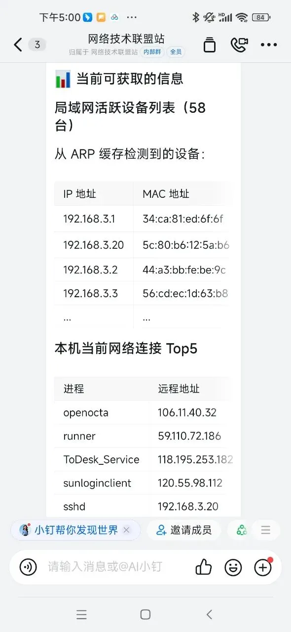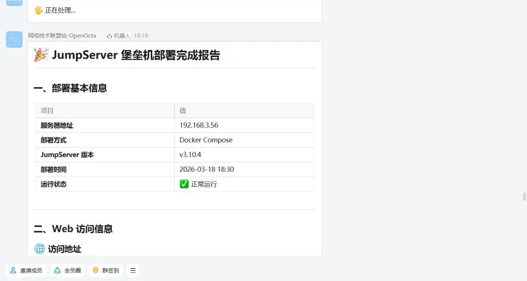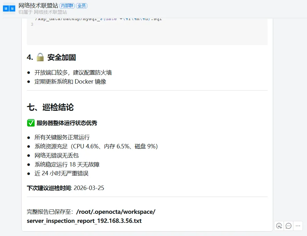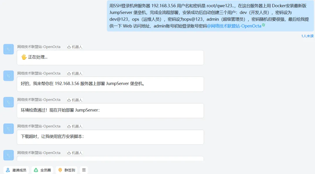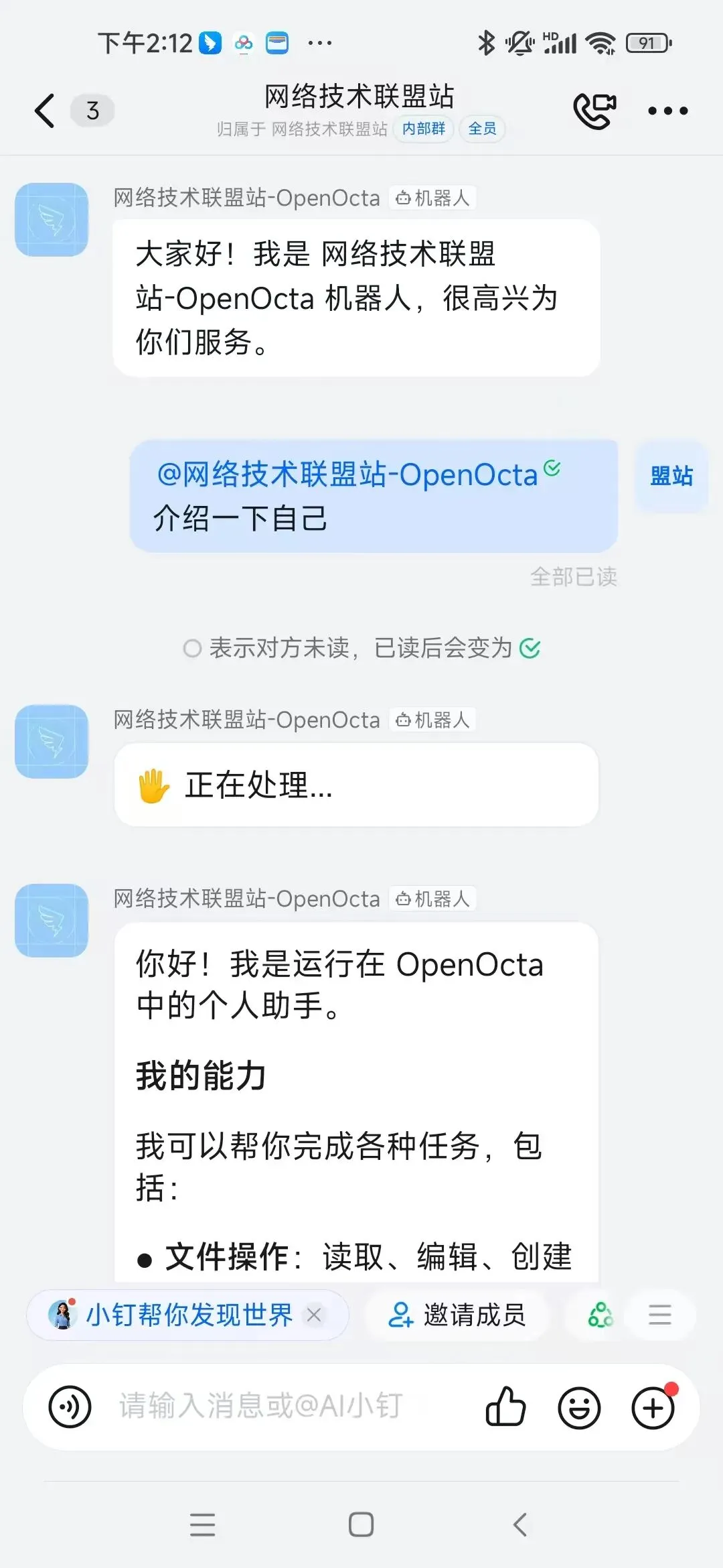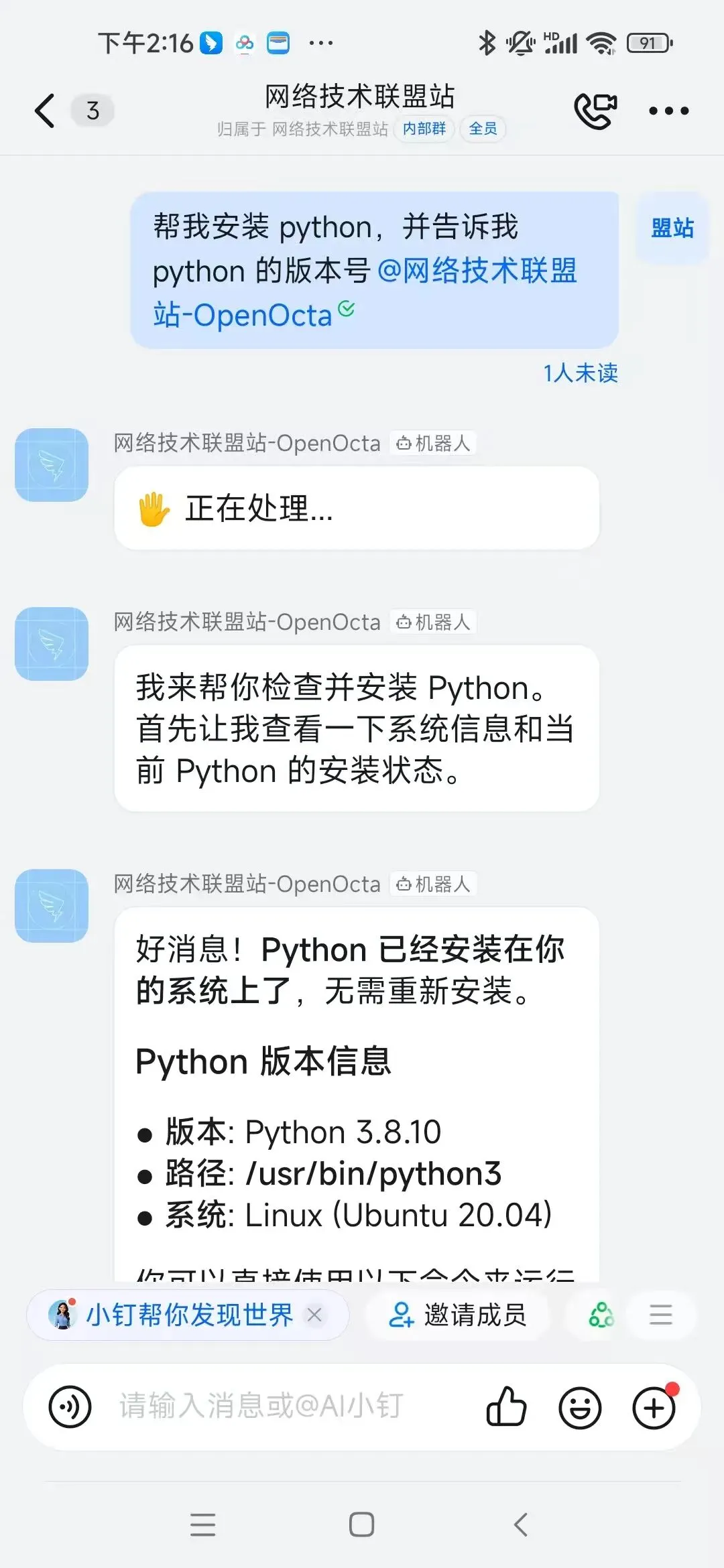 以下是我将OpenOcta接入钉钉,通过钉钉发指令给OpenOcta帮我快速巡检服务器的效果: