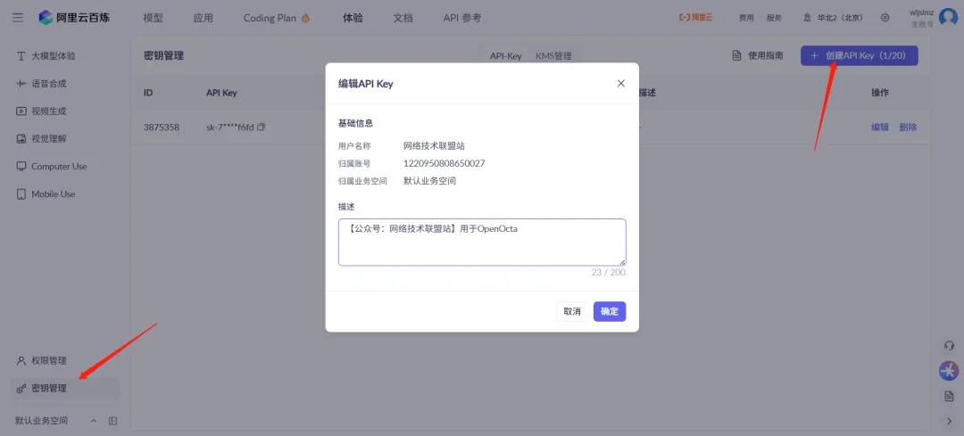 阿里百炼创建密钥复制好这个API Key用作配置。