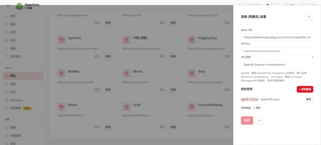 这里我用的是阿里百炼(通义千问),也可以接其他兼容 OpenAI 的模型。