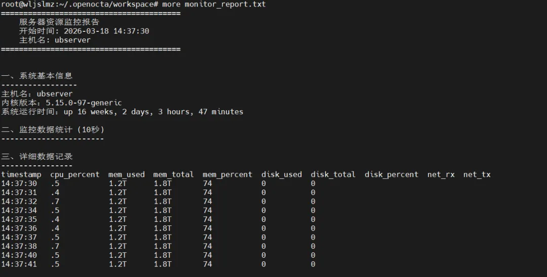 完整报告生成后存储在了/root/.openocta/workspace/路径下我们去服务器上看下这个路径: