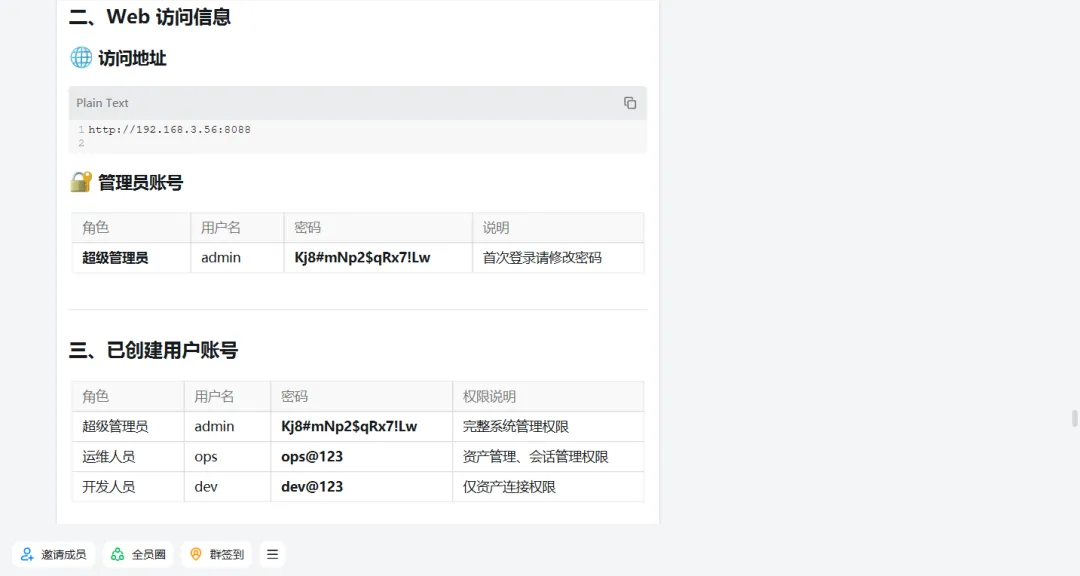 用SSH登录机房服务器 192.168.3.56 用户名和密码是 root/qwe123..,在这台服务器上用 Docker安装最新版 JumpServer 堡垒机,完成全流程部署,安装成功后自动创建三个用户:dev(开发人员),密码设为dev@123,ops(运维人员),密码设为ops@123,admin(超级管理员),密码随机但要很强,最后给我提供一下 Web 访问地址、admin账号初始登录账号密码