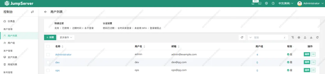 可以看到admin用户可以登录,并且能够看到新建的两个额外用户:dev和ops,一个字:绝!