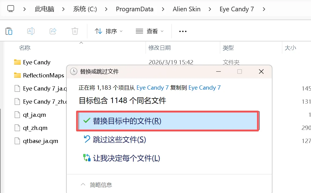 8、粘贴到C:\ProgramData\Alien Skin\Eye Candy 7文件夹下,点击替换