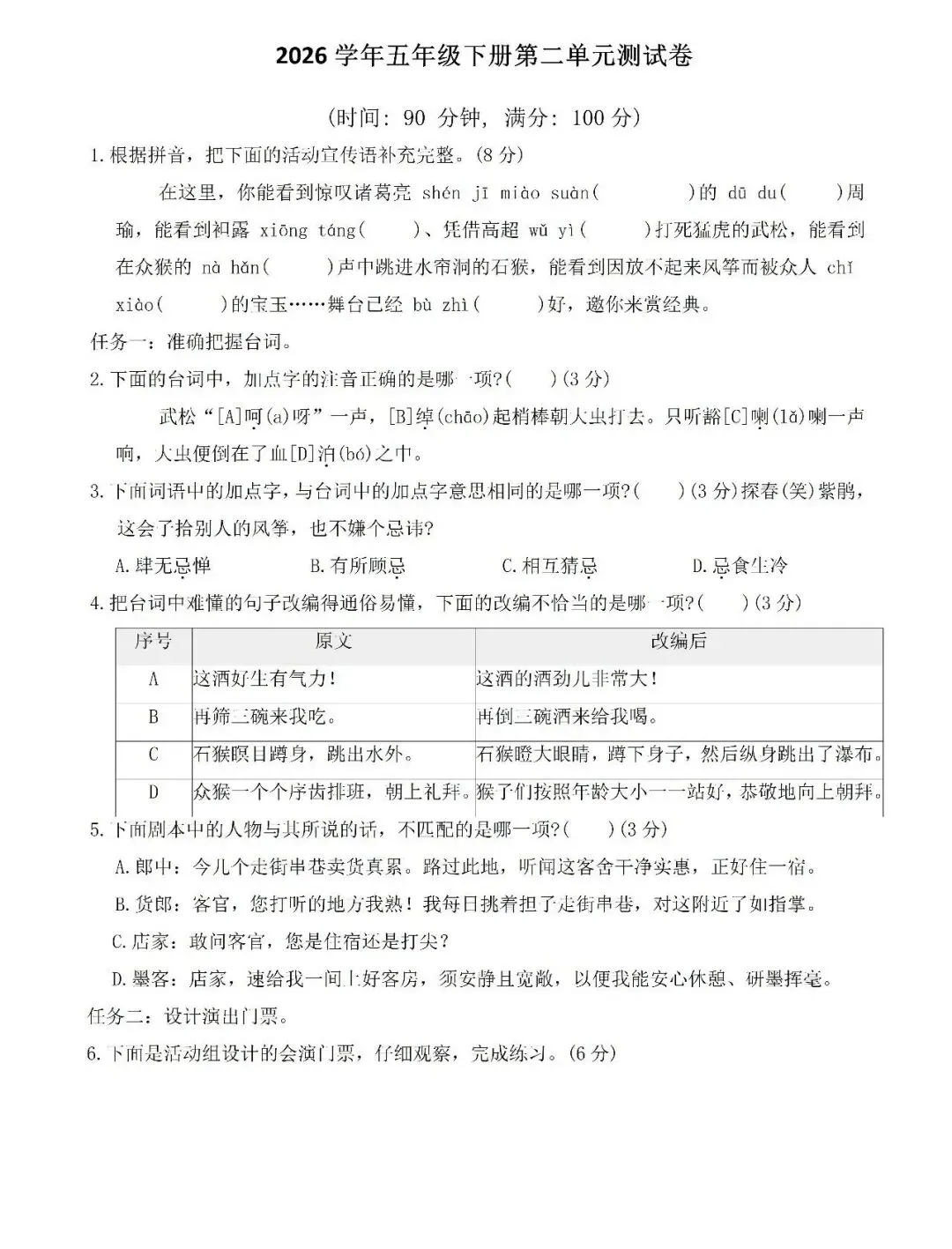 >2026学年五年级下册第二单元测试卷(免费下载)