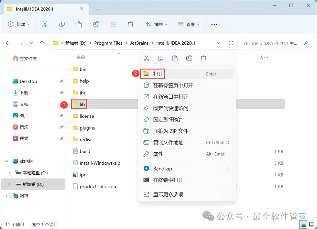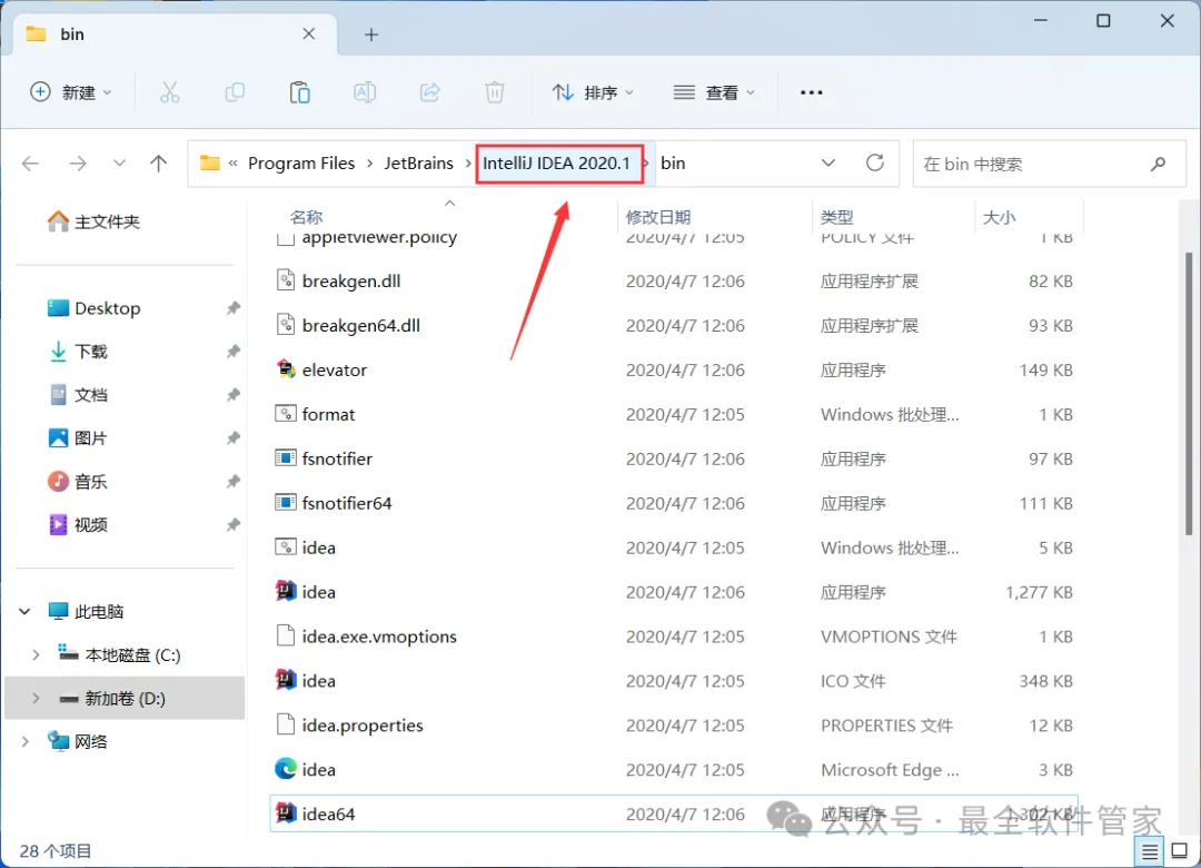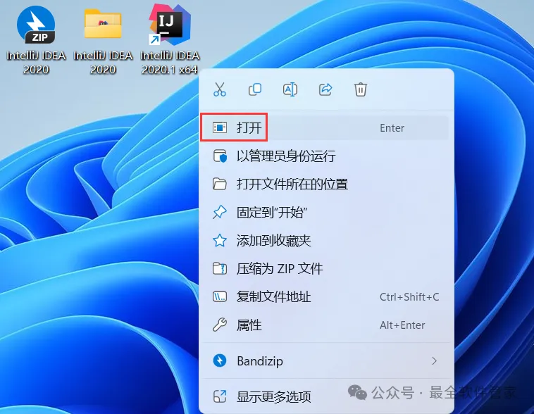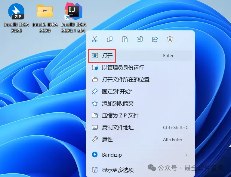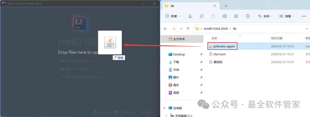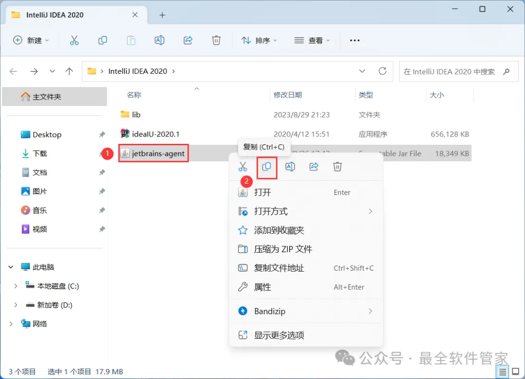 [软件名称]:IntelliJ IDEA 2020[不限速下载]:免费获取百度网盘不限速下载工具。公众号内回复:不限速[注意事项]:安装前请关闭网络、杀毒软件和防火墙,否则易安装失败。公众号内回复:1[解压软件]:小编用的解压软件是Bandizip,获取Bandizip软件安装包。公众号内回复:21、下载IntelliJ IDEA 2020软件安装包到电脑上,右键选择【解压到IntelliJ IDEA 2020\】3、找到【ideaIU-2020.1】应用程序,右键选择【以管理员身份运行】它5、软件默认安装在C盘,可自定义更改软件安装位置,这里小编选择安装在D盘;点击【Next】 10、回到桌面,右键桌面上的【IntelliJ IDEA 2020.1软件图标】,点击【打开】 14、勾选【Evaluate for free】,再点击【Evaluate】 15、回到IntelliJ IDEA 2020文件夹,找到【lib】文件夹,右键【打开】它16、将【jetbrains-agent】文件拖到软件界面内 21、回到IntelliJ IDEA 2020文件夹,找到【jetbrains-agent】文件,再右键点击【复制按钮】22、回到桌面,右键桌面上的【IntelliJ IDEA 2020.1软件图标】,点击【打开文件所在的位置】23、点击路径上的【IntelliJ IDEA 2020.1】 26、回到桌面,右键桌面上的【IntelliJ IDEA 2020.1软件图标】,点击【打开】33、以上就是IntelliJ IDEA 2020软件安装的全过程,要是对你有帮助的话,请为小编点个赞!免责声明:软件资源均来源于网络,仅供用户交流学习与研究使用,版权归属原版权方所有,版权争议与本公众号无关,用户本人下载后不能用作商业或非法用途,否则后果均由用户承担责任;如果您访问和下载此文件,表示您同意只将此软件用于参考、学习而非其他用途,否则一切后果请您自行承担,请于下载后24小时内删除,不允许用于商业用途,否则法律问题自行承担。如果您喜欢该软件,请支持正版软件,购买注册,得到更好的正版服务。