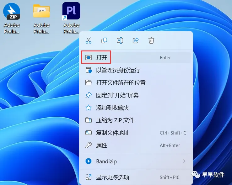 7、回到桌面,右键桌面上的【Adobe Prelude 2021软件图标】,点击【打开】