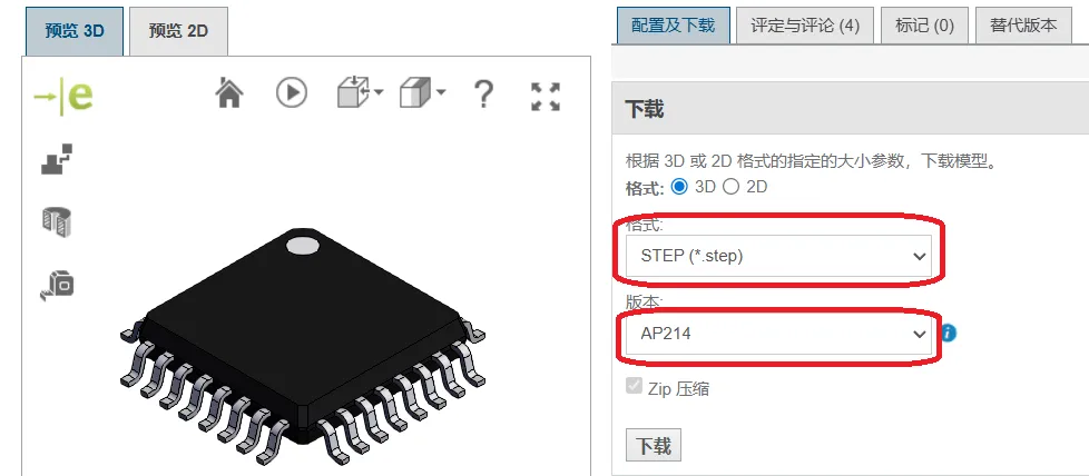 进入网站后输入器件型号,然后下载3D文件,如下图: