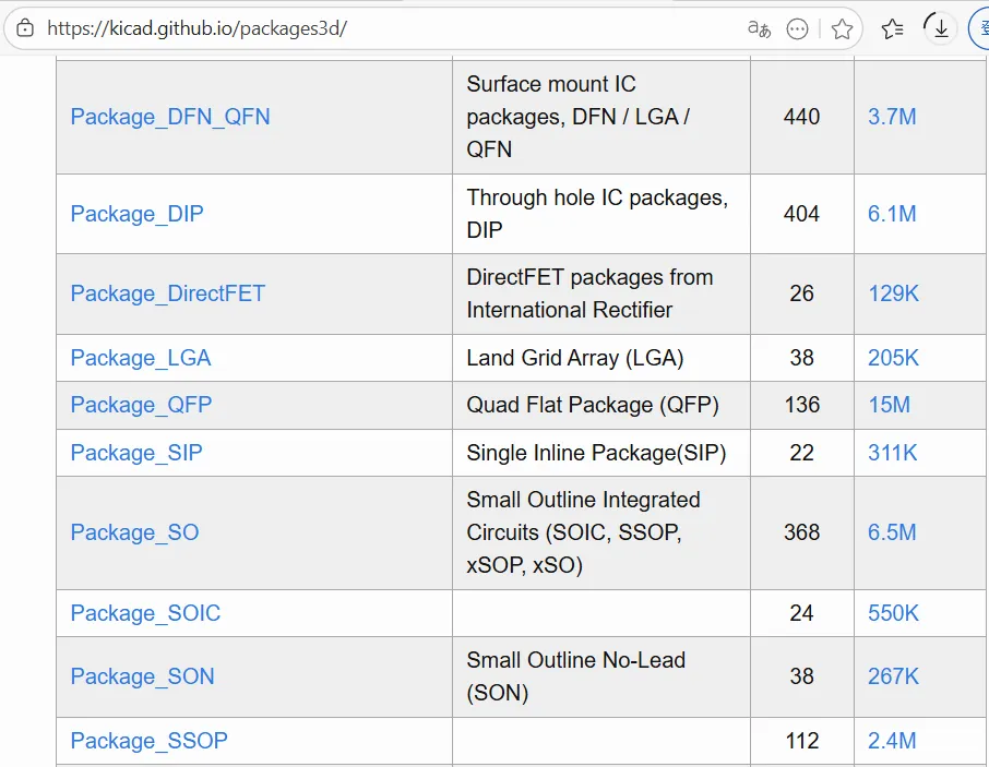 kicad.github.io 上的 3D 模型库专为 KiCad 5.x 设计,虽然与 6.x 及更高版本不兼容。但这个网站的3D文件按器件分类打包成一个文件,不需要一个一个器件的去下载,效率比较高。截取了部分器件列表如下: