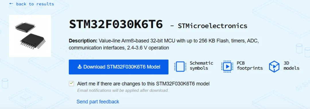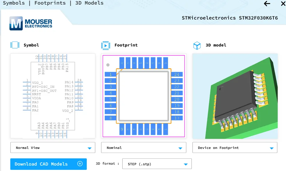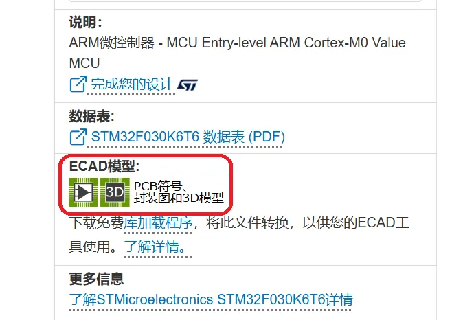 该网站为 Mouser(贸泽电子) 的官方网站,是一家专注于电子元器件分销的在线平台。进入网站后输入你使用的器件型号,比如“STM32F030K6T6”,找到ECAD模型。