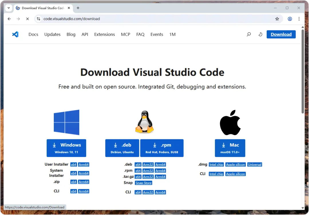 Visual Studio Code(简称 VS Code)是微软公司开发,跨平台支持 Windows、macOS 和 Linux 操作系统的一套功能强大的代码编辑器,可以帮助我们整合 WSL 2 的 Linux 子系统来进行项目开发。下载 VS Code