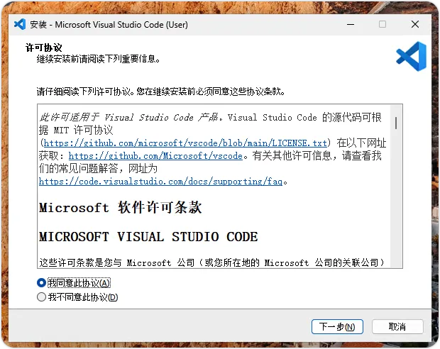 请按【Windows】按钮下载 Windows 10/11 最新版 Visual Studio Code,在本节的下载文件名是【VSCodeUserSetup-x64-1.111.0.exe】。安装 VS Code