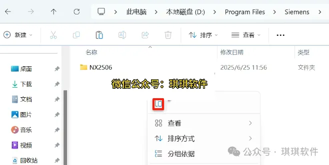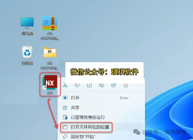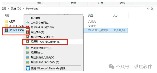 1.解压安装包:①鼠标右击【UG NX2506(64bit)】压缩包②选择电脑上安装的解压软件③点击【解压到UG NX2506(64bit)】。