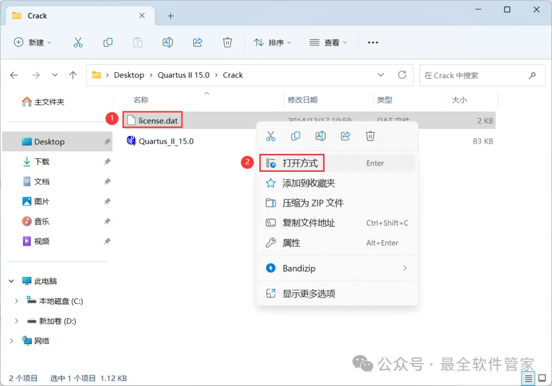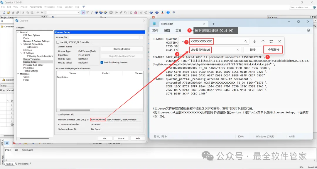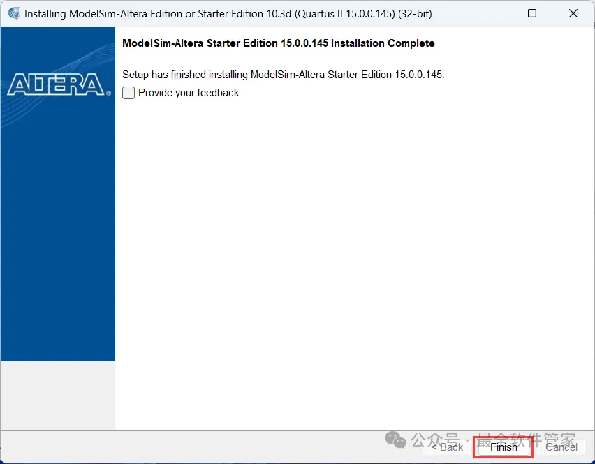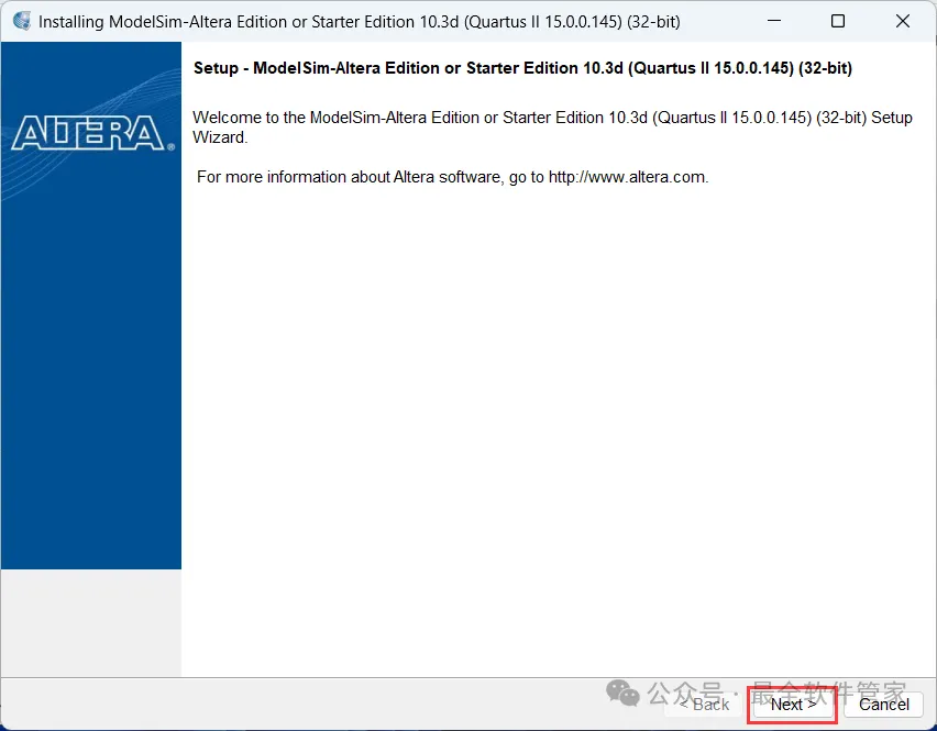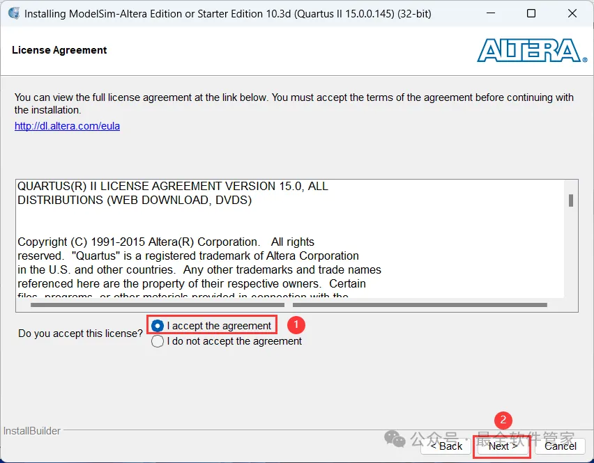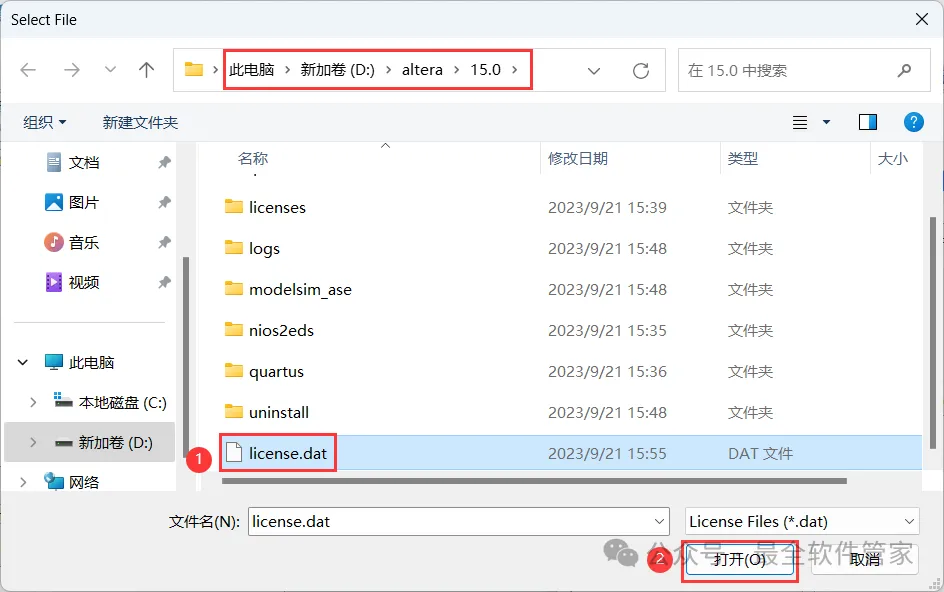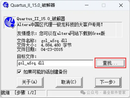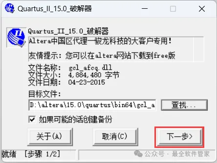 [不限速下载]:免费获取百度网盘不限速下载工具。公众号内回复:不限速[注意事项]:安装前请关闭网络、杀毒软件和防火墙,否则易安装失败。公众号内回复:1[解压软件]:小编用的解压软件是Bandizip,获取Bandizip软件安装包。公众号内回复:21、下载Quartus II 15.0软件安装包到电脑上,右键选择【解压到Quartus II 15.0\】4、找到【QuartusSetup-15.0.0】应用程序,右键选择【以管理员身份运行】它7、软件默认安装在C盘,可自定义更改软件安装位置,这里小编选择安装在D盘;点击【Next】11、不勾选【Launch USB…】,再点击【Finish】14、回到Setup文件夹,找到【ModelSimSetup-15.0.0】应用程序,右键选择【以管理员身份运行】它18、软件默认安装在C盘,可自定义更改软件安装位置,这里小编选择安装在D盘;点击【Next】23、回到Quartus II 15.0文件夹,找到【Crack】文件夹,右键【打开】它24、找到【Quartus_II_15.0】应用程序,右键选择【以管理员身份运行】它26、选择路径:D:\altera\15.0\quartus\bin64,找到并选中【gcl_afcq.dll】文件,再点击【打开】31、回到桌面,右键桌面上的【Quartus II 15.0软件图标】,点击【打开】32、勾选【Start the…】,再点击【OK】33、依次点击【Tools】、【License Setup…】34、回到Crack文件夹,找到【license.dat】文件,右键点击【打开方式】36、按下记事本的替换快捷键【Ctrl+H】,第一栏输入:XXXXXXXXXXXX,打开软件界面,将软件的【NIC ID】填入到记事本的【第二栏】内,再点击【全部替换】38、回到Crack文件夹,找到【license.dat】文件,再右键点击【复制按钮】39、打开路径:D:\altera\15.0,再右键文件夹的空白处,点击【粘贴按钮】41、选择路径为D:\altera\15.0,找到并选中【license.dat】文件,再点击【打开】44、以上就是Quartus II 15.0软件安装的全过程,要是对你有帮助的话,请为小编点个赞!免责声明:软件资源均来源于网络,仅供用户交流学习与研究使用,版权归属原版权方所有,版权争议与本公众号无关,用户本人下载后不能用作商业或非法用途,否则后果均由用户承担责任;如果您访问和下载此文件,表示您同意只将此软件用于参考、学习而非其他用途,否则一切后果请您自行承担,请于下载后24小时内删除,不允许用于商业用途,否则法律问题自行承担。如果您喜欢该软件,请支持正版软件,购买注册,得到更好的正版服务。