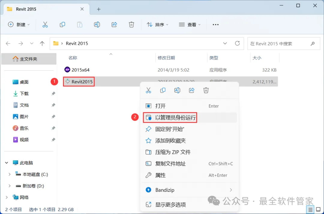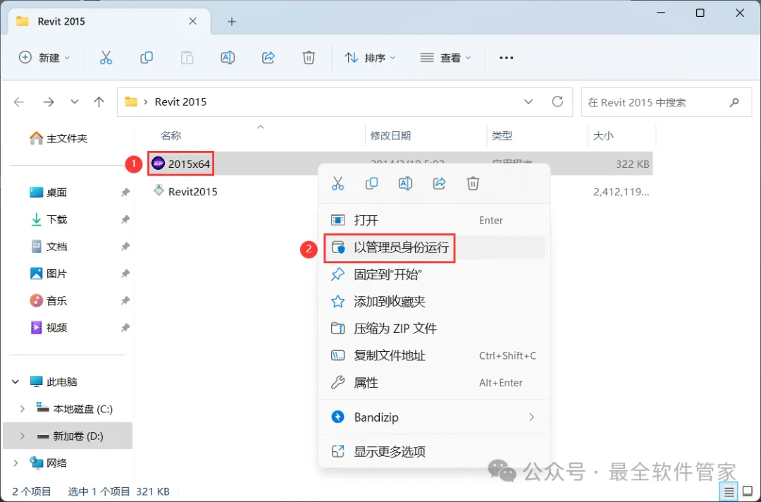 18、回到Revit 2015文件夹,找到【2015x64】程序,右键选择【以管理员身份运行】它