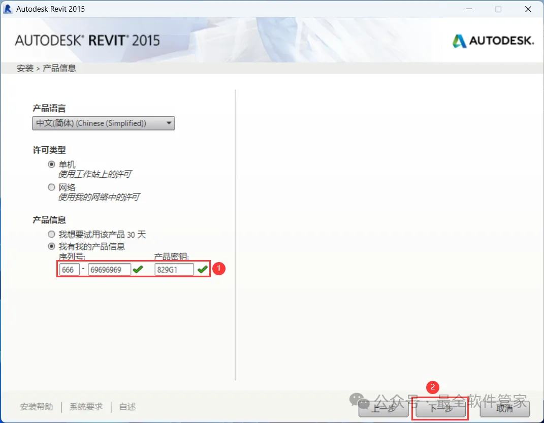 7、序列号输入:666-69696969,产品密钥输入:829G1,再点击【下一步】