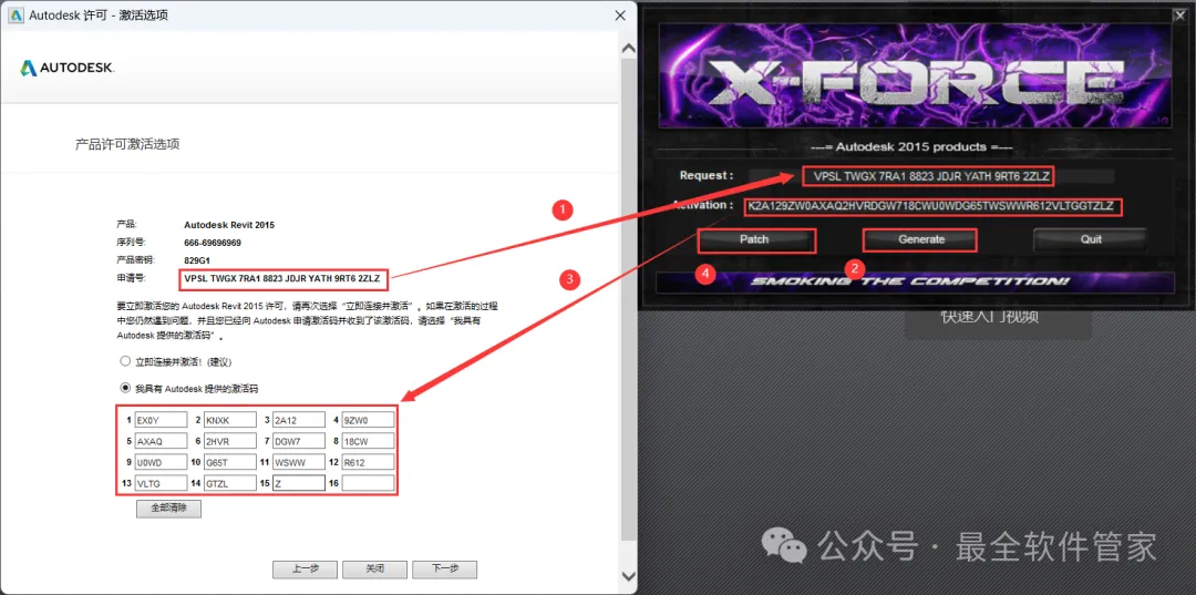 19、打开软件界面,将软件的【申请号】填入到程序的【Requset】内,再点击【Generate】,将程序的【Activation】填入到软件的【激活码】内,再点击【Patch】