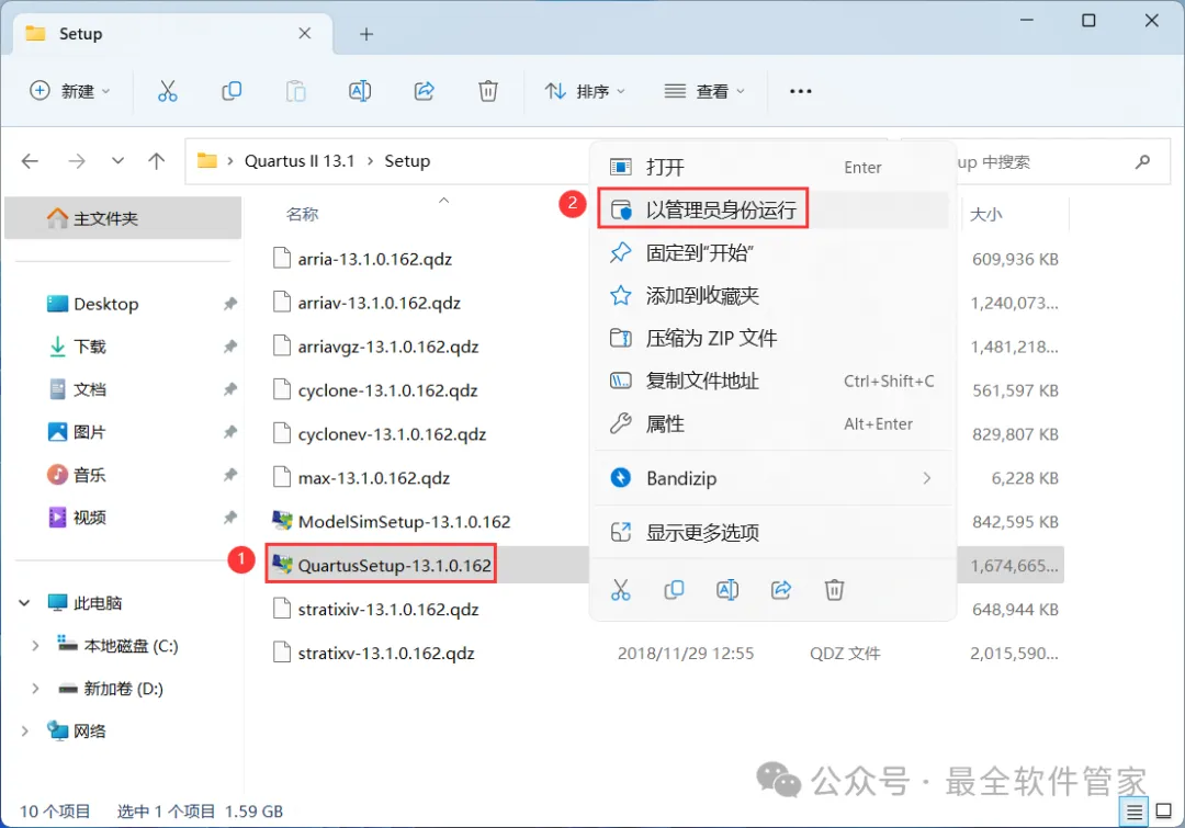 14、回到Setup文件夹,找到【ModelSimSetup-13.1.0】应用程序,右键选择【以管理员身份运行】它