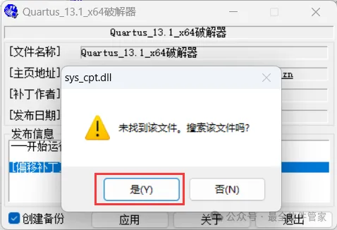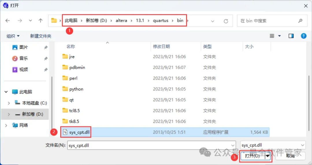 27、选择路径:D:\altera\13.1\quartus\bin,找到并选中【sys_cpt.dll】文件,再点击【打开】