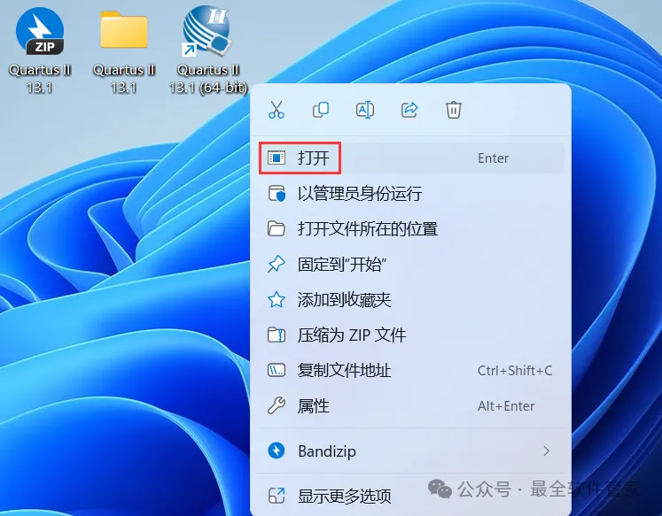 30、回到桌面,右键桌面上的【Quartus II 13.1软件图标】,点击【打开】