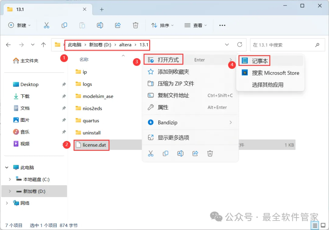 34、打开路径:D:\altera\13.1,找到【license.dat】文件,右键点击【打开方式】,再点击【记事本】