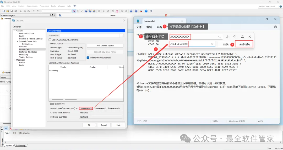 35、按下记事本的替换快捷键【Ctrl+H】,第一栏输入:XXXXXXXXXXXX,打开软件界面,将软件的【NIC ID】填入到记事本的【第二栏】内,再点击【全部替换】