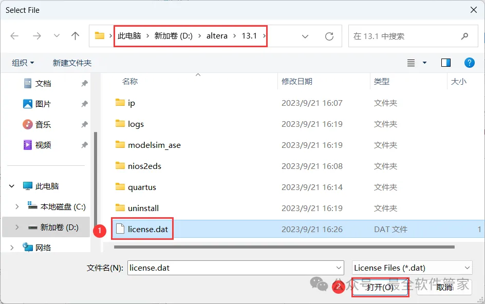 38、选择路径为D:\altera\13.1,找到并选中【license.dat】文件,再点击【打开】