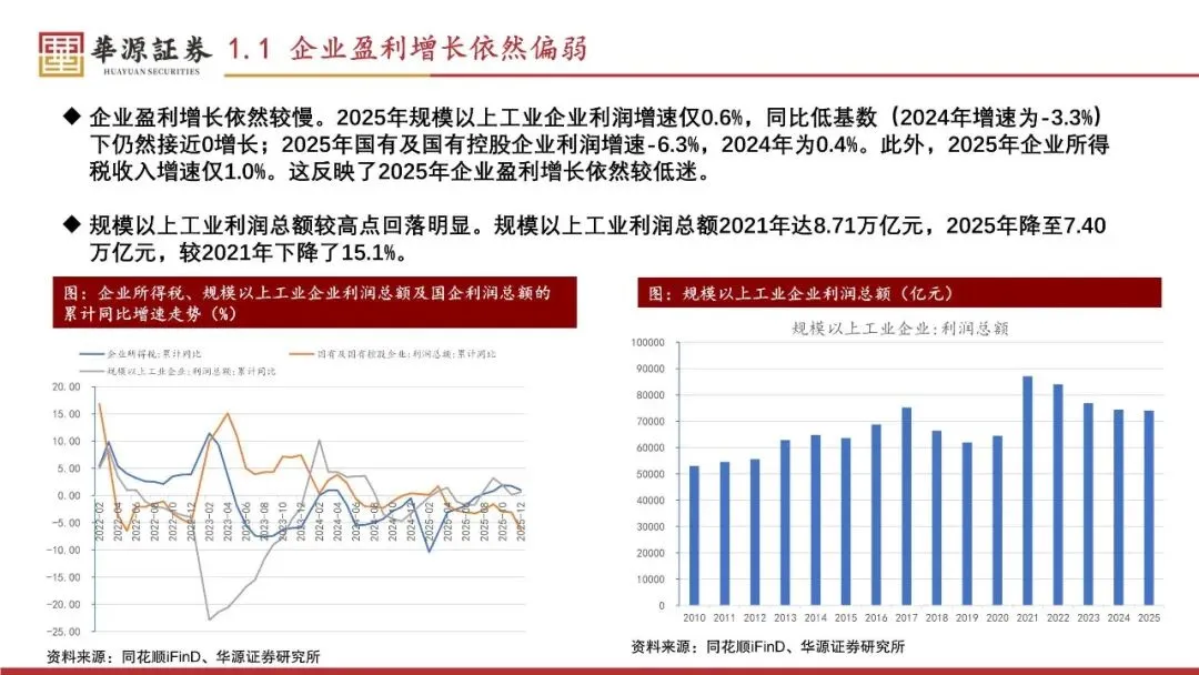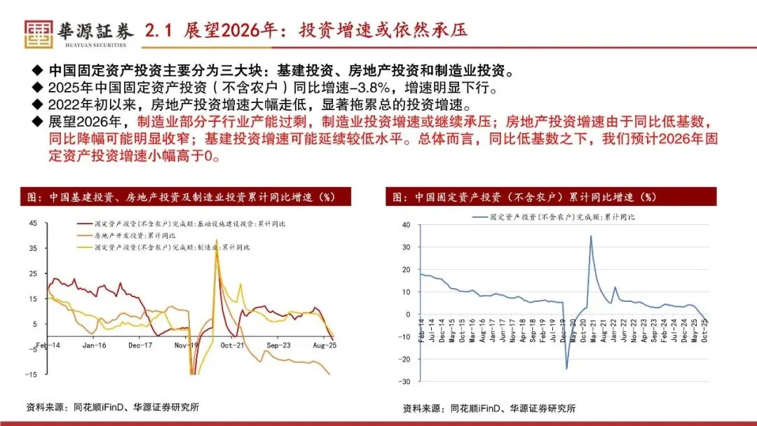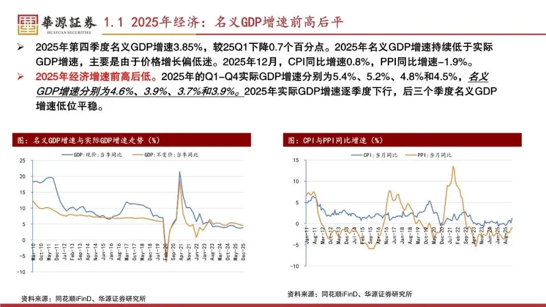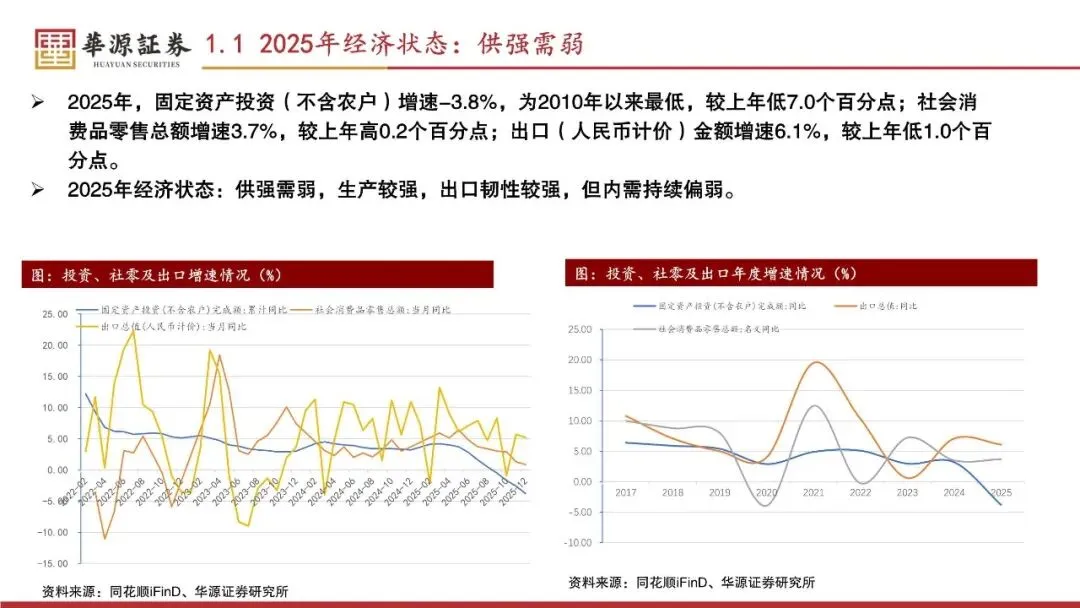 2025年的Q1-Q4实际GDP增速分别为5.4%、5.2%、4.8%和4.5%,名义GDP增速分别为4.6%、3.9%、3.7%和3.9%。2025年实际GDP增速逐季度下行,后三个季度名义GDP增速低位平稳。2025年,固定资产投资(不含农户)增速-3.8%,为2010年以来最低,较上年低7.0个百分点;社会消费品零售总额增速3.7%,较上年高0.2个百分点;出口(人民币计价)金额增速6.1%,较上年低1.0个百分点。