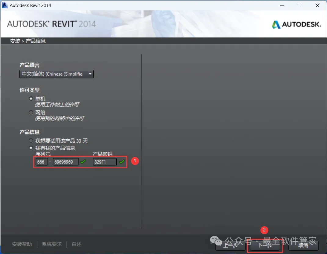 7、序列号输入:666-69696969,产品密钥输入:829F1,再点击【下一步】