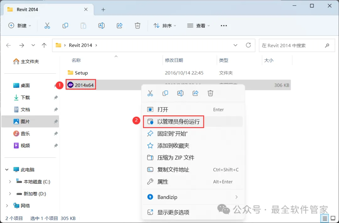 18、回到Revit 2014文件夹,找到【2014x64】程序,右键选择【以管理员身份运行】它