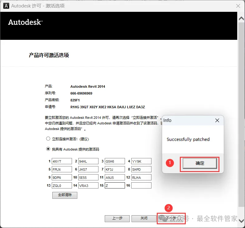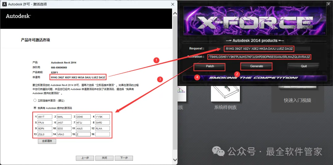 19、打开软件界面,将软件的【申请号】填入到程序的【Requset】内,再点击【Generate】,将程序的【Activation】填入到软件的【激活码】内,再点击【Patch】