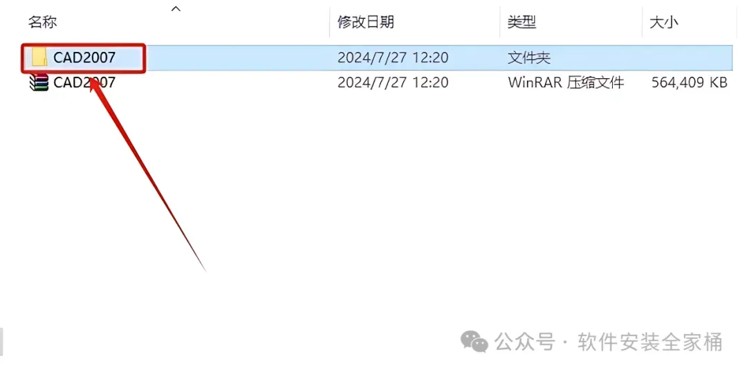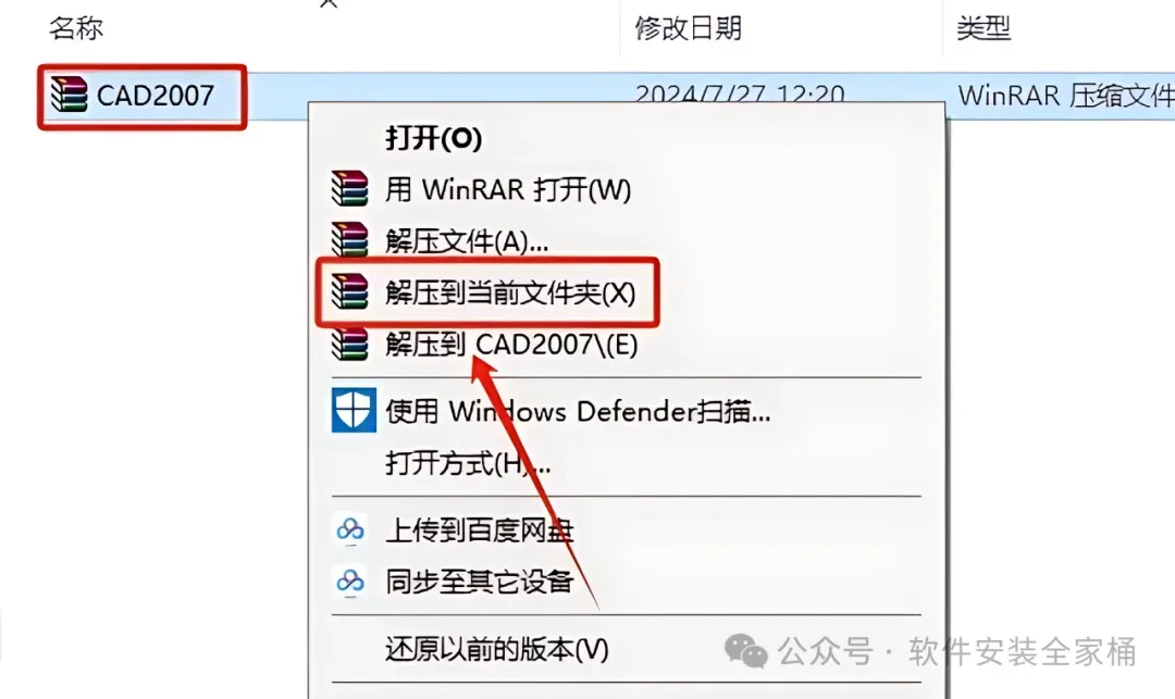 1.鼠标右击【CAD2007】选择【解压到当前文件夹】。