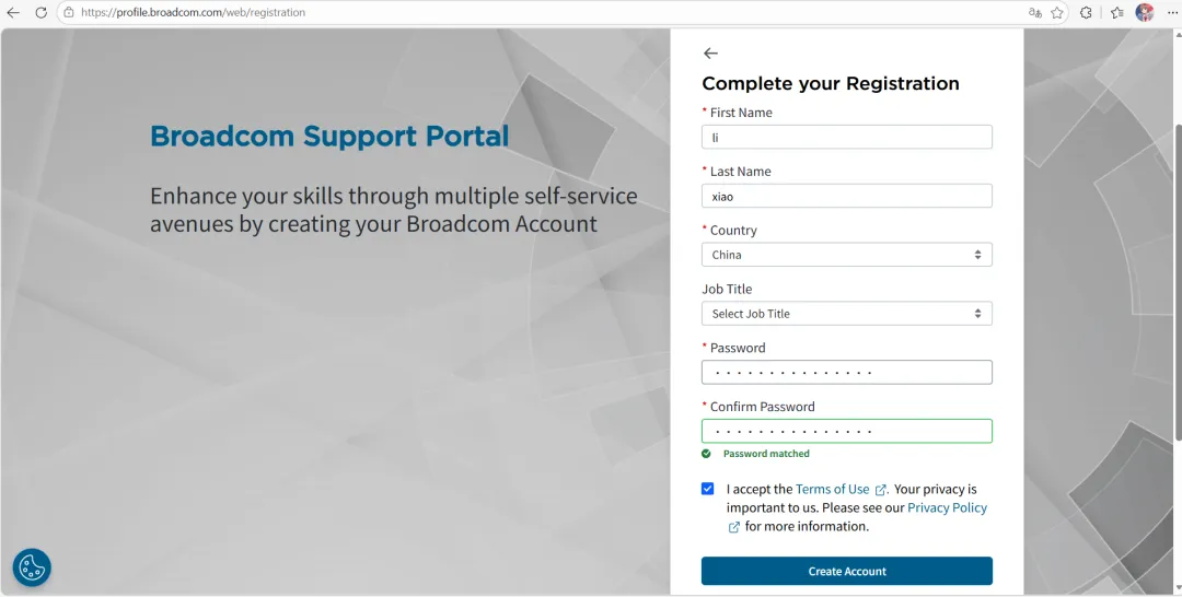 所有下载统一迁移到 Broadcom,官方入口(需登录)https://support.broadcom.com/,进入网站后先注册,如下图所示接下来输入一些信息,像下面这样,填完之后就注册完成了,接下来是登录很多人卡在这一步,同意选项勾选不了,我们先点击下圈着的部分继续操作至此,我们已完成 VMware Workstation Pro 的下载与安装全过程。