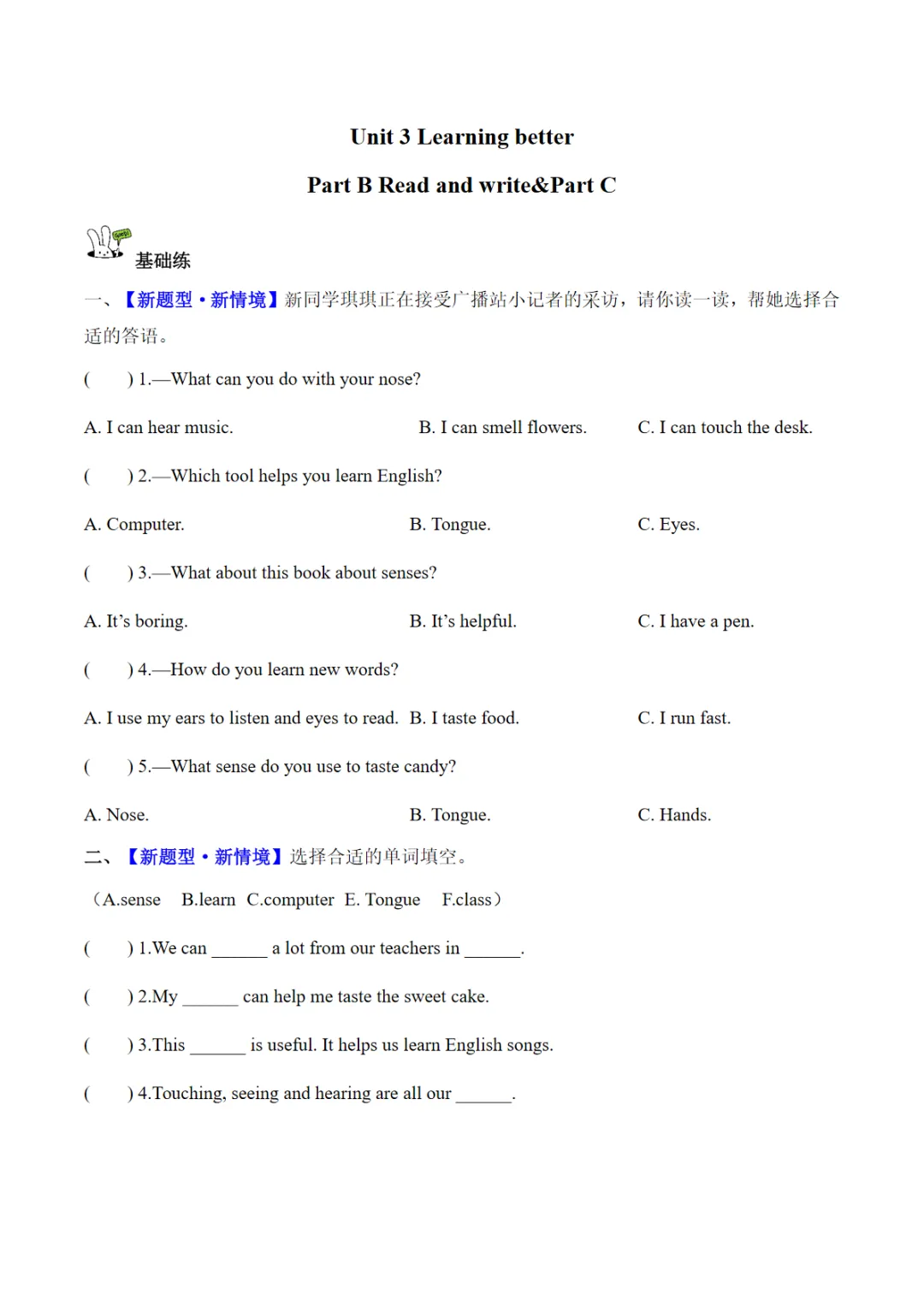 【免费下载】Unit 3 第6课时 Part B Read and write& Part C(分层作业)英语人教PEP版三年级下册(新教材),WORD电子版,可编辑,可打印