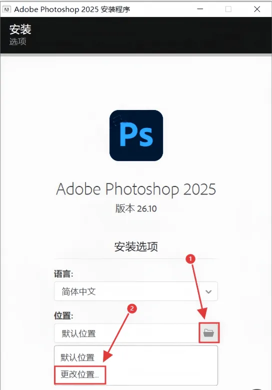 4.点击【文件夹图标】展开,然后点击【更改位置】。(C盘内存够大也可以直接点击安装)