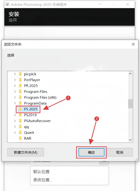 5.选择安装路径,例如可以在D盘新建一个命名为【PS 2025】的文件夹,选中后点击【确定】。