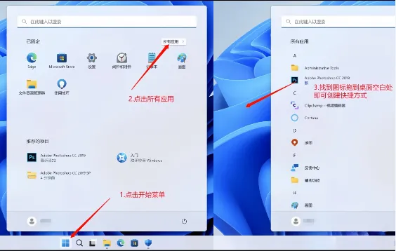 9.返回桌面,点击下方开始菜单,找到刚刚安装的PS程序,直接拖动到电脑桌面即可成功创建桌面快捷方式。