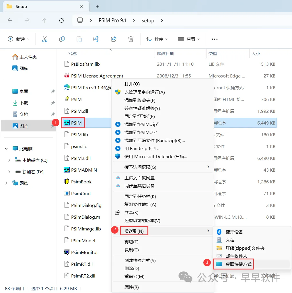 7、找到【PSIM】程序,右键依次点击【显示更多选项】、【发送到】、【桌面快捷方式】,完成软件桌面快捷方式的创建