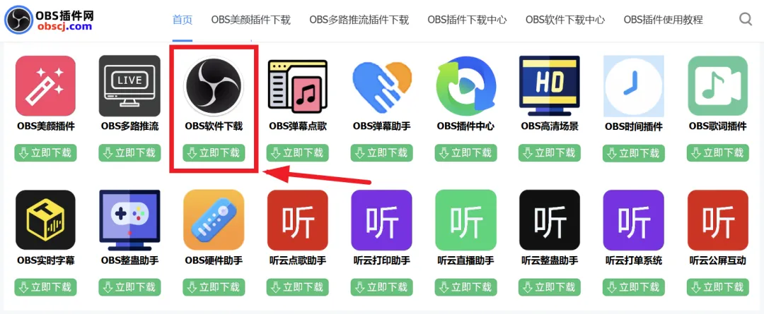 除了上述两个下载地址,还可以直接访问【OBS插件网】官方网站:obscj.com去下载,如下图所示,查看红色箭头所指的位置,然后点击绿色按钮【立即下载】即可