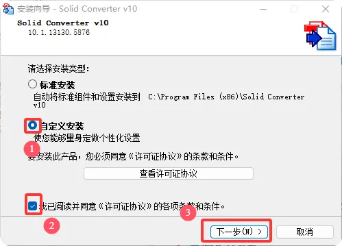 3.点选【自定义安装】,勾选【我阅读并同意......】,点【下一步】。