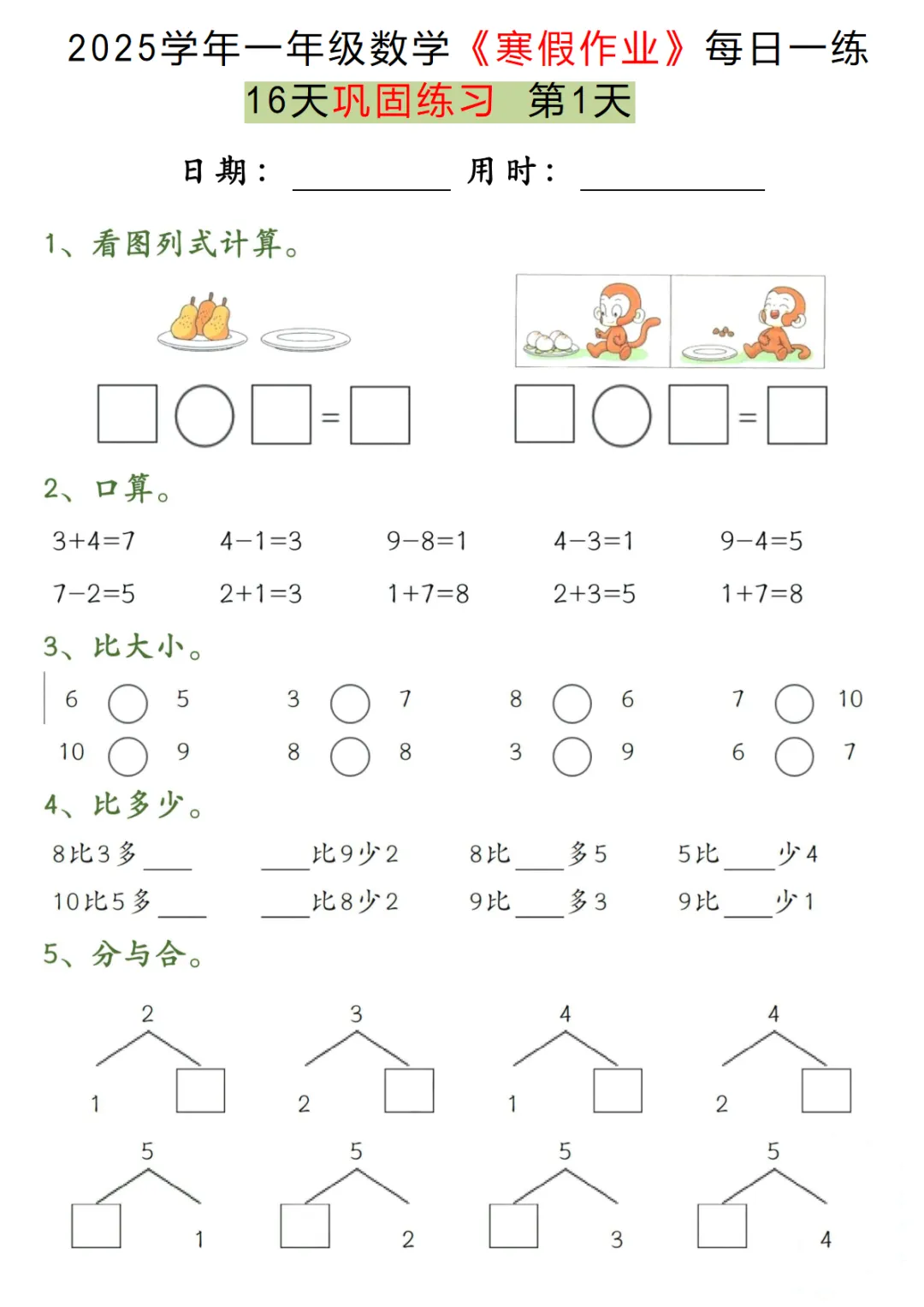 【免费下载】一年级(下)数学 《寒假作业》每日一练(16天)