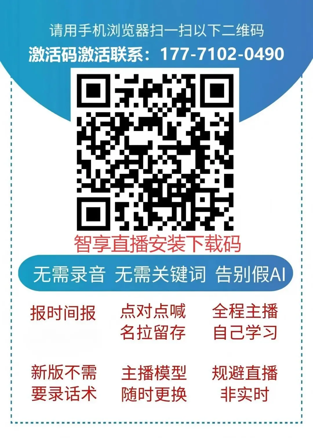 下载完成后,若弹出“禁止安装未知来源应用”提示,按以下路径操作: 设置 → 安全/隐私 → 特殊权限 → 安装未知应用 → 允许当前浏览器安装 ✅ 安装完成后,立即关闭该权限,保障手机安全,避免恶意软件私自安装;安装完毕直接打开软件,无需额外解压、激活前置操作。安装完成后,需激活才能使用完整版功能,激活流程极简,全程2步搞定,无复杂操作,拒绝繁琐认证。打开智享AI直播三代软件,完成账号注册(手机号一键注册即可);联系唯一官方客服:177-7102-0490,获取专属激活码,无其他代理激活渠道,谨防假冒客服诈骗;复制激活码,粘贴到软件激活界面,点击确认激活,立即解锁AI智能讲解、实时弹幕互动、24小时循环开播等全部功能。激活后不用摸索复杂设置,聚焦核心功能操作,先把直播开起来,后续再慢慢优化细节,全程分为3个核心环节,零门槛上手。环节一:直播画面准备(5分钟搞定,不用专业设备)