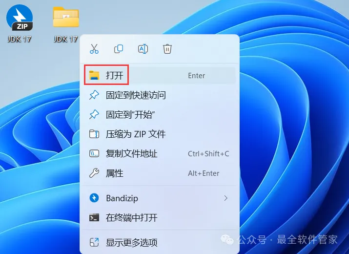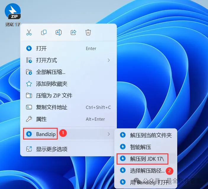 1、下载JDK 17软件安装包到电脑上,右键选择【解压到JDK 17\】